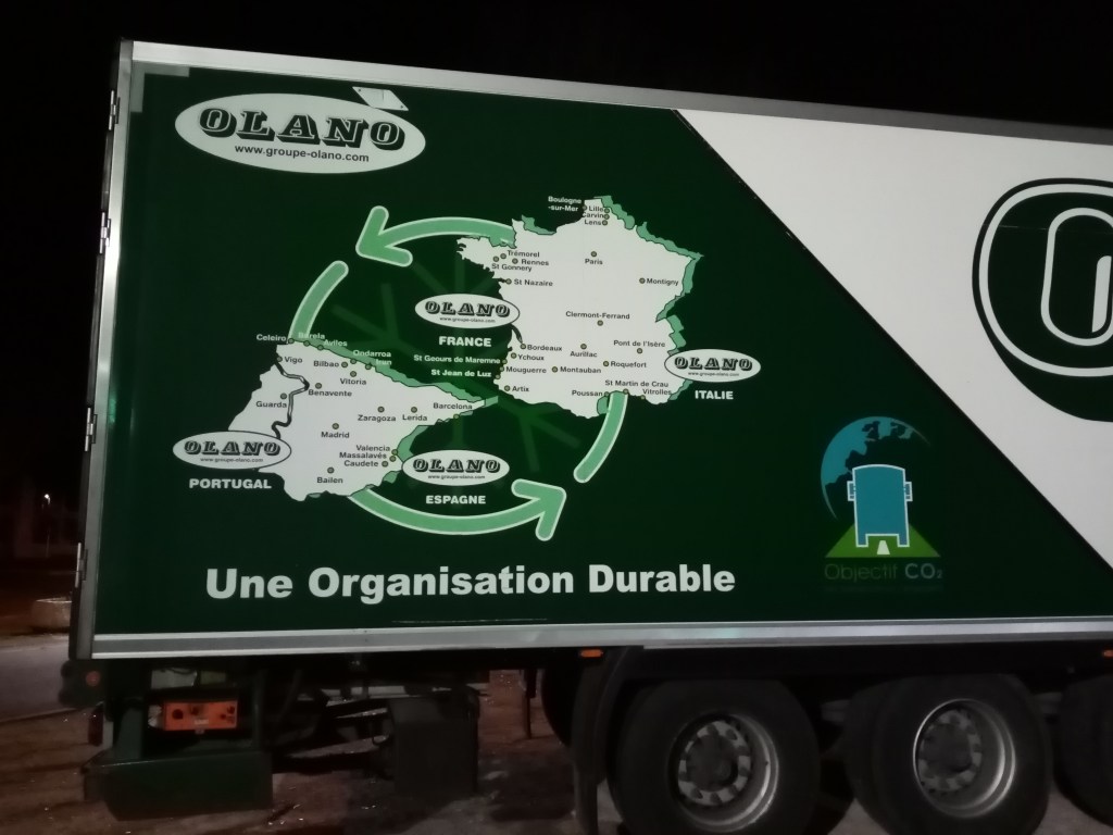 Un camion plus gros : un tracteur et sa semi-remorque. Transports frigorifiques. Visuel de l’entreprise en gros : OLANO. Firme originaire du pays basque français. Plusieurs pays : France, Espagne et Portugal en silhouettes + l’Italie seulement nommée. Des localisations précises et nombreuses : l’implantation des sites du groupe. Car Olano est un groupe comme l’indique la mention de son site web. Et voilà la route physique reliée aux flux numériques. Les flèches tournantes indiquent une autre logique que celle de la seule route. On est dans la logistique, la gestion de la mobilité. Le camion, ici, c’est un point d’entrée (un objet) dans un monde de réseaux de camions, de marchandises, d’informations et de capitaux. On est à l’échelle européenne. A la carte sur la remorque, répondent des cartes sur le site web de l’entreprise. Olano participe de la géographie économique de l’Europe.