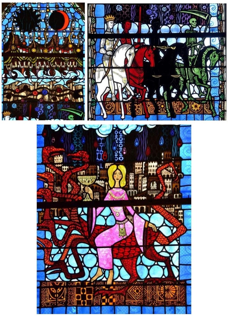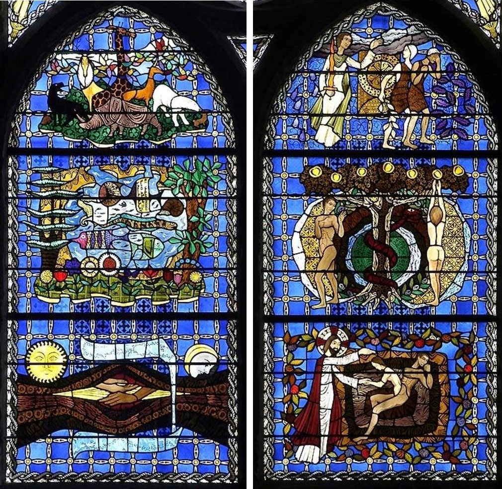 Formes stylisées des personnages sur les vitraux de l’Apocalypse et de la Genèse réalisés par Alain Makaraviez et Edwige Walmé en 1982 et 1992 pour la cathédrale de Clermont. Voir : https://www.cathedrale-catholique-clermont.fr/vitraux-xx/ et ci-dessous ;
