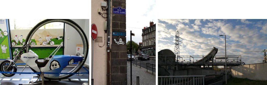 Des formes Michelin quand même : la moto-roue exposée à l’Office du tourisme ; un Bibendum façon Invader ; les toboggans Michelin aperçus au moment de quitter la ville – voir ci-dessous.
