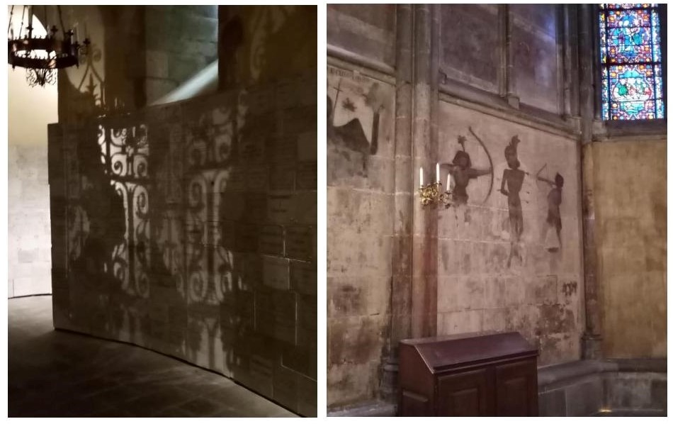 Formes ombres dans le déambulatoire de Notre-Dame-du-Port et sur une abside de la cathédrale (silhouette retrouvée d’un Saint-Sébastien longtemps recouvert d’enduis) – voir ci-dessous ;