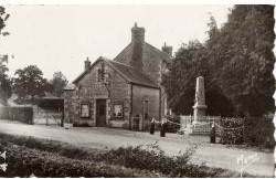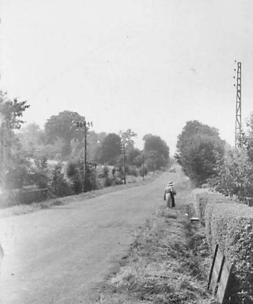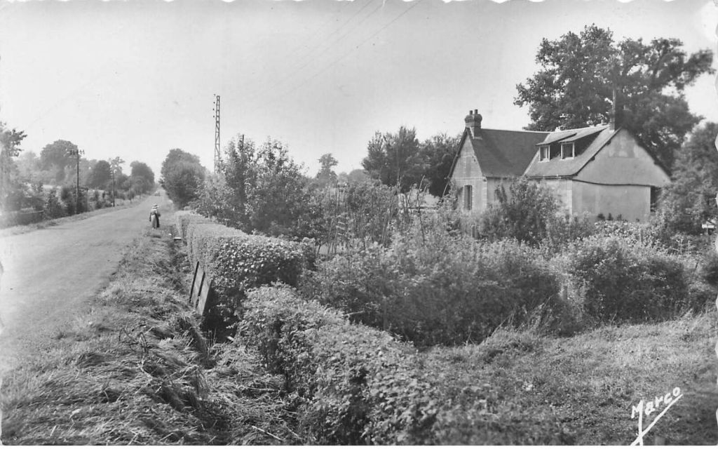 Un peu comme dans la partie gauche de cette autre carte postale prise dans l’axe de la route de Carrouges et La Ferté-Macé. A droite, la petite villa qu’habite Mademoiselle Tourment, l’ancienne institutrice et maire du village. Peut-être est-ce elle que l’on voit sur le bord de la route. De l’autre côté, le même grand champ que sur l’autre carte postale.