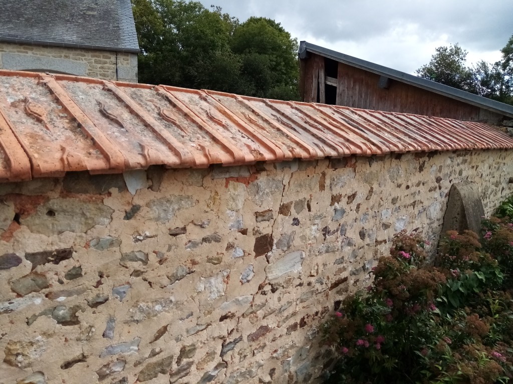 C’est l’enduit un peu jaune toujours en place qui s’est rappelé à moi, onctueux à l’œil, granuleux sous les doigts. Et les tuiles posées sur le faîte du mur, un côté « sud » pour une maison d’école et une mairie couvertes en ardoises.