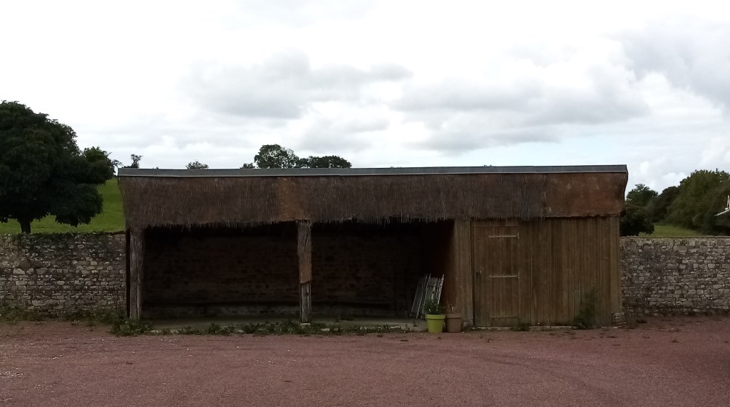 Les arrière-plans de bocage, derrière la silhouette du préau, derrière les murs de la cour de l’école côté Ouest. Des chênes hauts, une colline longue couronnée d’arbres embrumés. Comme dans la partie gauche de la carte postale, une des anciennes cartes postales de La Ferrière-Béchet, représentant la mairie, l’école et le monument aux morts. Le portail de la cour, le préau dans le fond, les chênes, la profondeur esquissée d’un bocage…