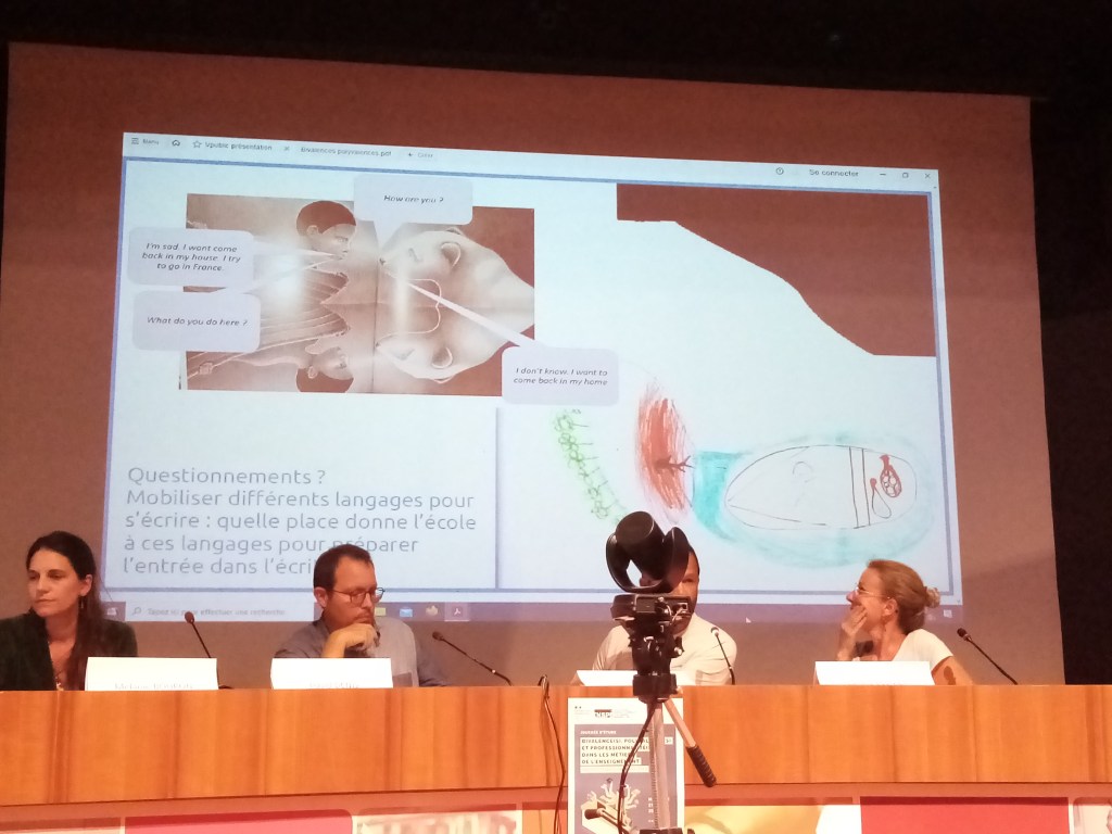 Enfin Mohammad, enfant réfugié syrien, habitant actuellement Perseigne. Denis raconte. L’enfant mutique. Le choix de l’ouvrage de littérature jeunesse : On va où ? Un ours blanc en dérive sur un morceau de glace rencontre un jeune garçon dérivant lui aussi. Mohammad commencera par dessiner. C’est ce qui est sur la diapositive, à droite, au moment où je photographie. Un bateau. Il a traversé la Méditerranée orientale. Denis finit par comprendre que les parents de Mohammad partis de Syrie ont été en esclavage en Libye avant d’arriver en Europe. Le dessin permettra à l’enfant de commencer à parler.