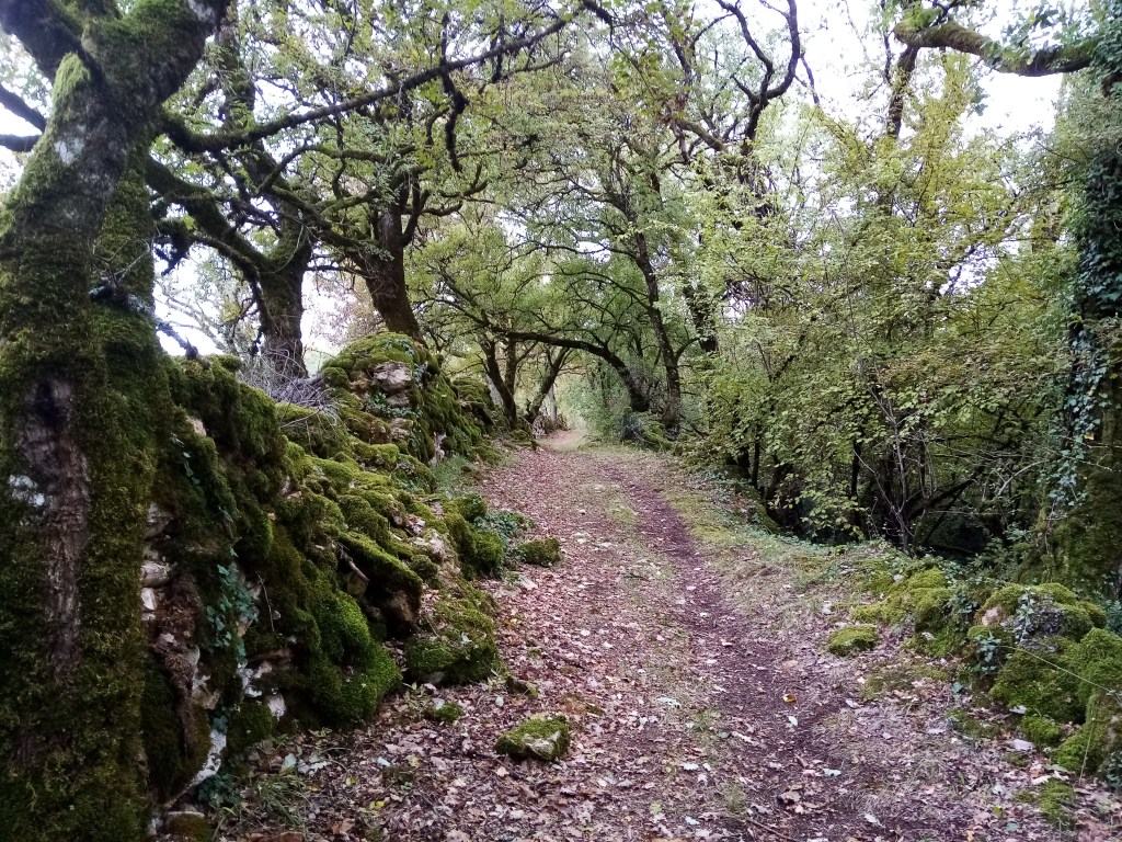 Grande échelle : La perte d’une partie des feuillages dégage un peu la vue et permet de saisir des horizons plus vastes qu’en été, à partir d’altitudes plus basses. La lumière y est aussi pour quelque chose, contrastant les masses sombres des premiers plans avec les horizons plus clairs. On a assez tôt dans la promenade cette ouverture sur les causses derrière le clocher de l’église. Il n’est pas difficile de s’imaginer le reste du causse même si on ne le voit pas. Là, c’est la direction de Livernon et plus à droite (à l’Est), c’est Espédaillac. Nous avons pensé aux transhumances qui d’Espédaillac rejoignaient le Cantal en passant au pied du Ligoussou, en face de nous, pour descendre dans la vallée du Célé et rejoindre Figeac, avant d’attaquer les premières pentes vers Maurs. Voir à ce sujet : https://wordpress.com/post/jeanfrancoisthemines788063388.wordpress.com/3447