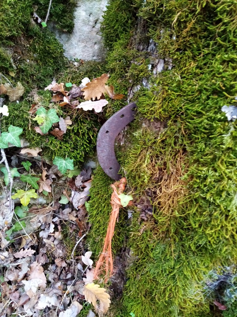 Petite échelle : la lumière tamisée de l’automne – et le dégagement d’une partie des feuilles et des plus hautes herbes – aide à voir des « détails ». Ces détails font en général trace d’un geste, d’une intention, du travail humain. On pense rarement que ces murs de pierre ont été dressés, que leurs pierres ont été choisies, déplacées, disposées ; que les chemins aussi ont été tracés, souvent nivelés, empierrés, empruntés pour aller de maison en jardin et en pré, de village en village, de parcelle en parcelle (pour les moutons, les chèvres et les vaches). Tant de pas qui font le sol de ces chemins tel qu’il est aujourd’hui. Bon, il y a aussi les pas des sangliers qui colorent d’argile les pierres éboulées, en suivant des tracés perpendiculaires aux chemins. Un exemple de détail : ce fer à cheval enfoncé par ces deux extrémités dans le tronc d’un chêne pour servir d’attache. Chemin du Roc.