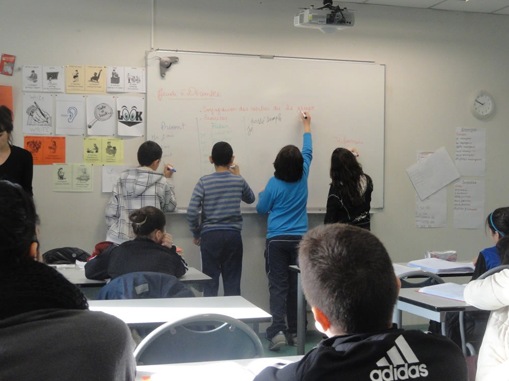 Quatre élèves sont au tableau pour y conjuguer le même verbe à des temps différents. Le tableau est une prise, laquelle diffère d’un élève à l’autre, pour ceux qui écrivent comme pour ceux qui regardent en fonction de leur facilité d’apprentissage : les quatre temps grammaticaux n’offrent pas les mêmes aspérités ; il est possible de regarder de une à quatre conjugaisons en train d’être écrites.