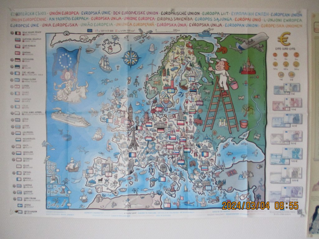 2° l’Europe en drapeaux et en monuments : jeu amusant avec les clichés nationaux, voire régionaux (le menhir et Obélix). Mais une carte qui ne se préoccupe ni des réseaux/mobilités, ni des imbrications et interpénétrations des langues et cultures européennes et extra-européennes, invisibilisant ainsi des millions de personnes