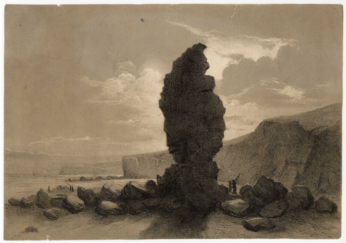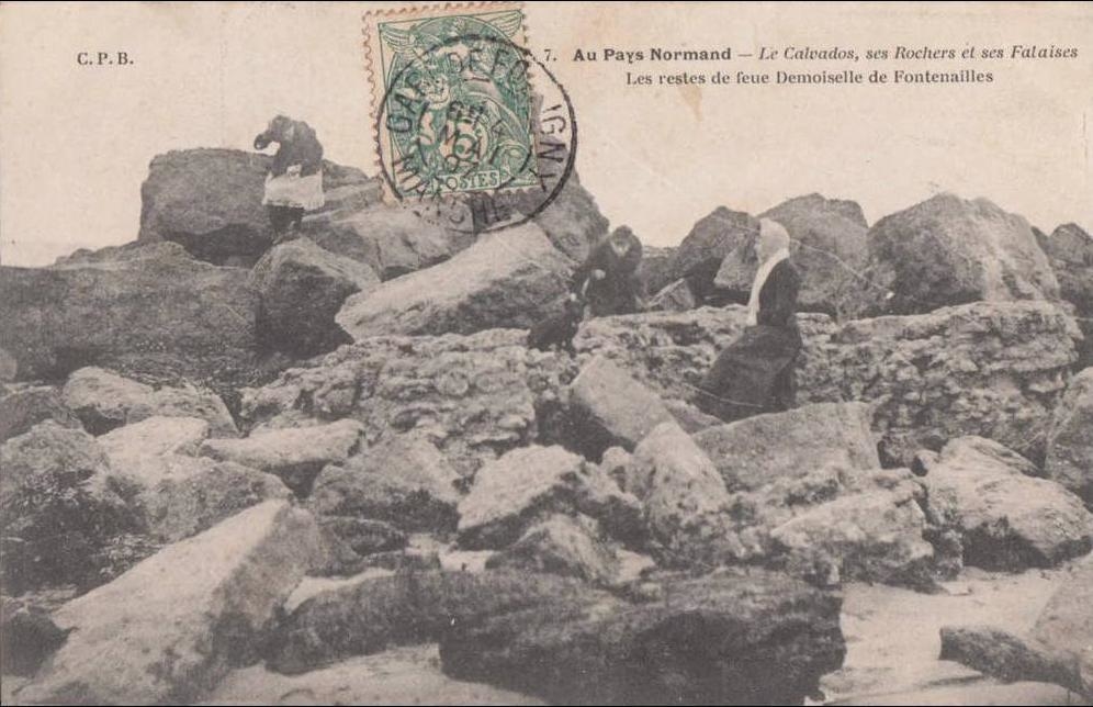 Ici, les ruines, ce sont les falaises. On est dans le « Chaos de Longues », entre Port-en-Bessin et Arromanches. Les effondrements y donnent lieu à la création de formes spectaculaires. Il y eut ainsi les « Demoiselles de Fontenaille », trois masses rocheuses dont la dernière s’est écroulée en 1902.