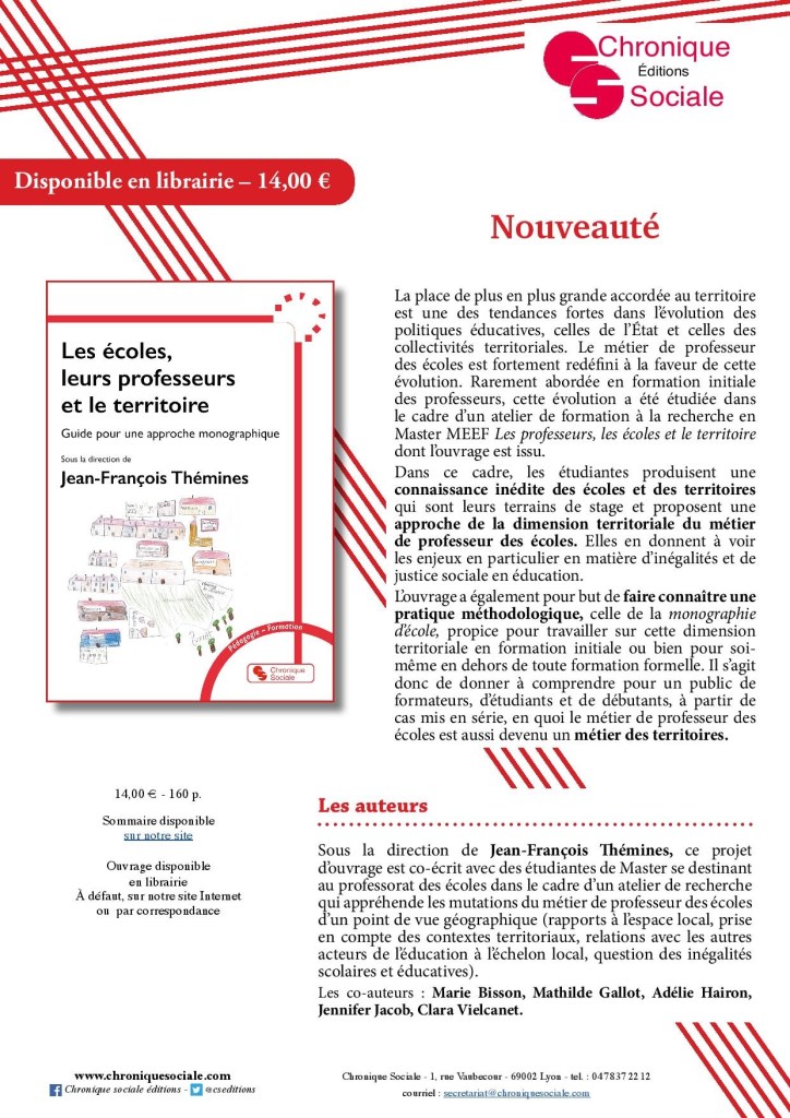 La pratique de la monographie pour moi-même comme chercheur dans l’équipe ANR Inégalités éducatives (dir. Olivier David), puis dans l’équipe CERIM (dir. J.-F. Thémines et Eric Delamotte) (Thémines, Delamotte, Le Guern et al., 2020) m’avait aussi convaincu des vertus de cette approche exigeante au quotidien de la recherche (les carnets de terrain), obligeant à la modestie dans les conclusions (pas de généralisation quantitative), mais « redoutable » en ce qu’elle dévoile d’inégalités éducatives produites « à bas bruit » dans les communes et d’une commune à l’autre.