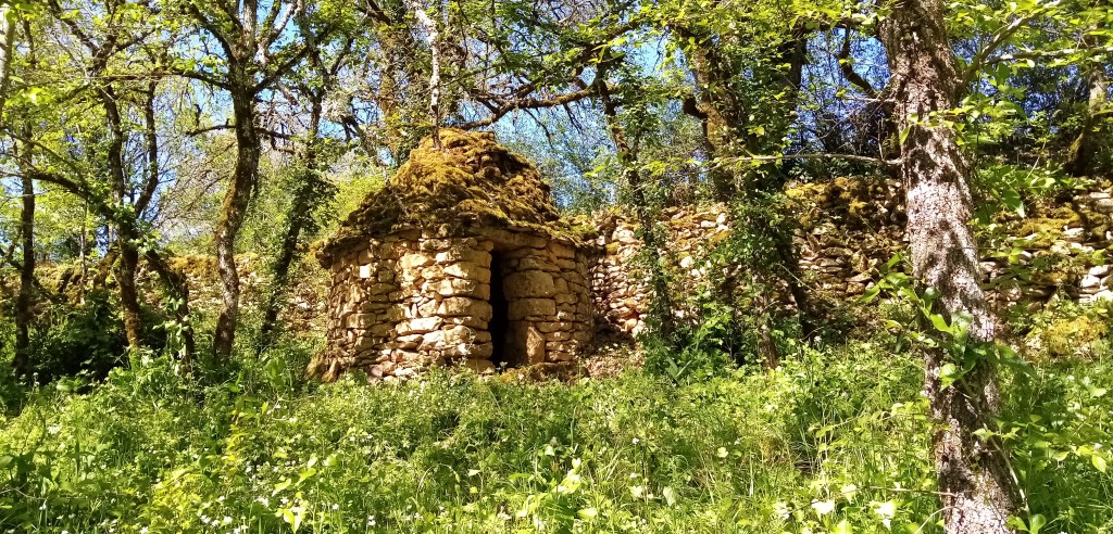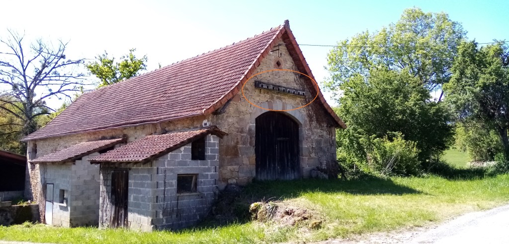 L’une des granges derrière le château d’Assier, le noyer près d’elle, le champ qui couvre la colline derrière ; le pigeonnier de Galiot construit au XVIe siècle un peu à l’écart du bourg, ses 2300 boulins nichaient les pigeons. Matérialisation du pouvoir de ce seigneur ; morceau de patrimoine aujourd’hui.