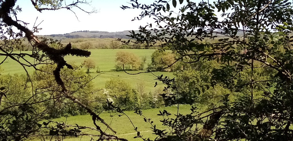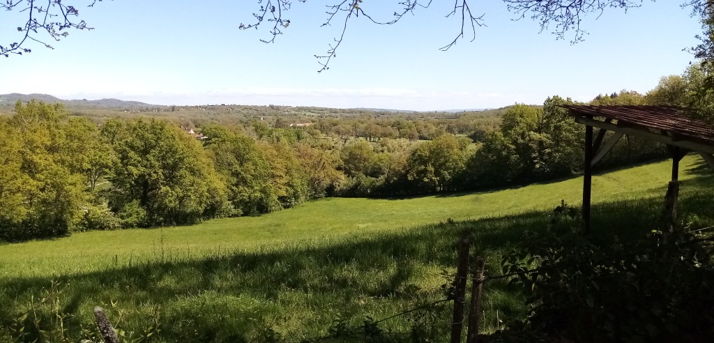 L’abri aux ânes, sans âne à cette heure. Une vue magnifique sur le Ségala, avec au premier rang les collines du Bois-Bordet (Le Bourg) et de Saint-Bressou.