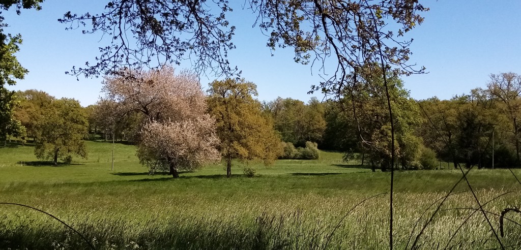 Ferme du Parc dominant de longs prés arborés, les moutons au grand air, les arbres monumentaux, chênes et merisier (poirier ?)