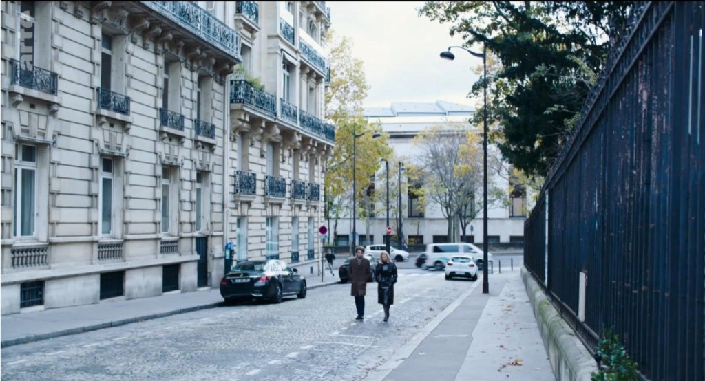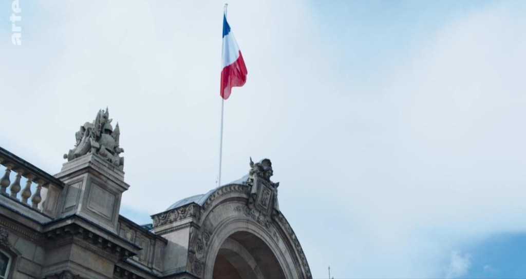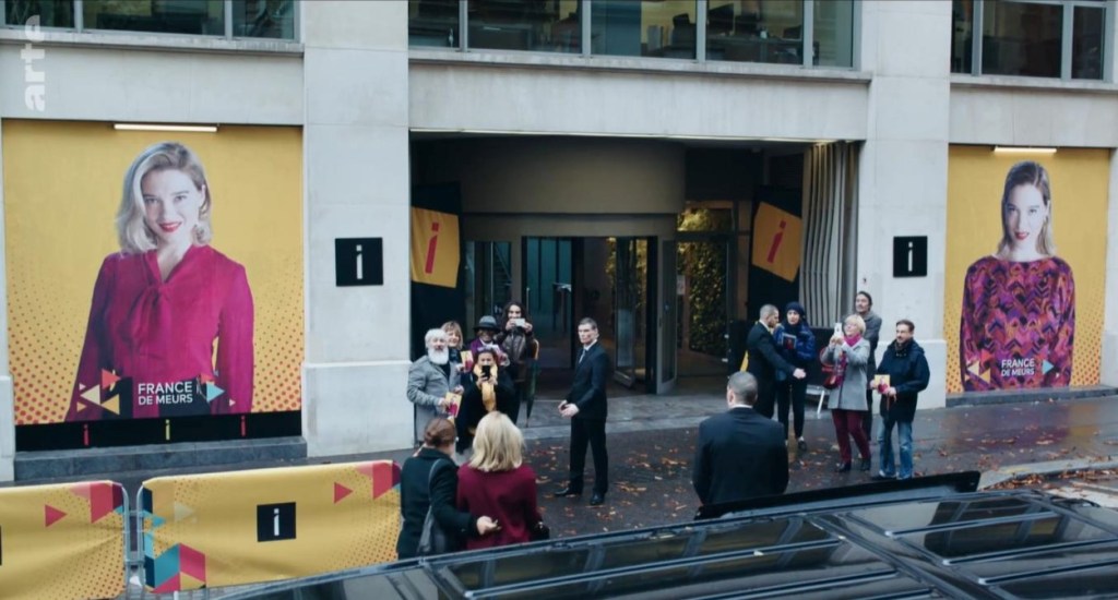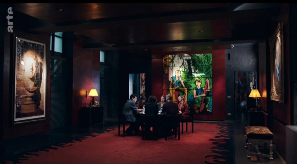 - d’un côté les places du pouvoir et des médias, des lieux centraux visibles (l’Elysée, la place de l’Etoile), des lieux plus feutrés où l’on entre sur invitation (réunion de patrons et de responsables de fonds d’investissement), un intérieur lourdement décoré (l’art classique et l’art contemporain réunis dans l’appartement tout de noir peint de France) ;