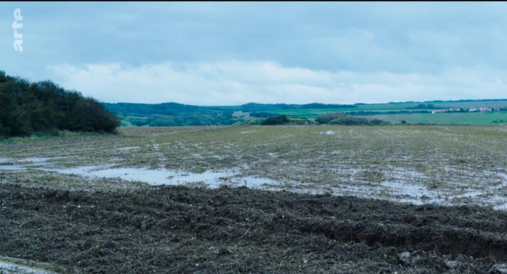 Paysage de campagne (les Flandres ?). D’abord vue à travers l’écran d’un reportage sur l’assassinat d’une enfant, la campagne s’impose comme paysage de/pour France lorsqu’après s’être longtemps arrêtée devant le mémorial constitué pour cette enfant, elle prend le temps de sentir le vent, puis de voir les horizons (labours, champs et bois).