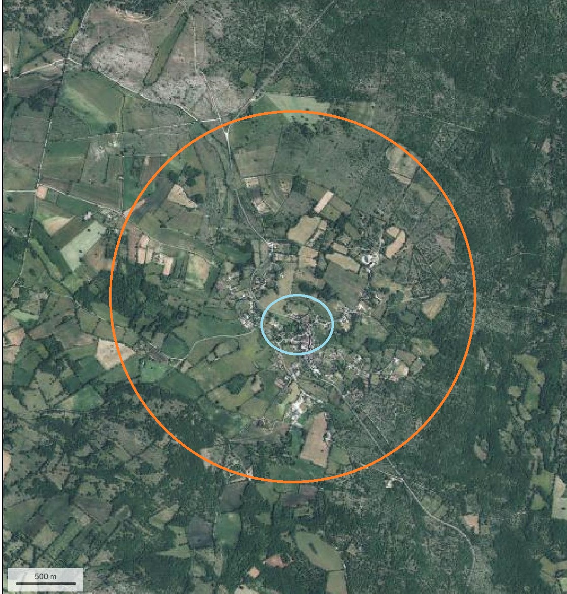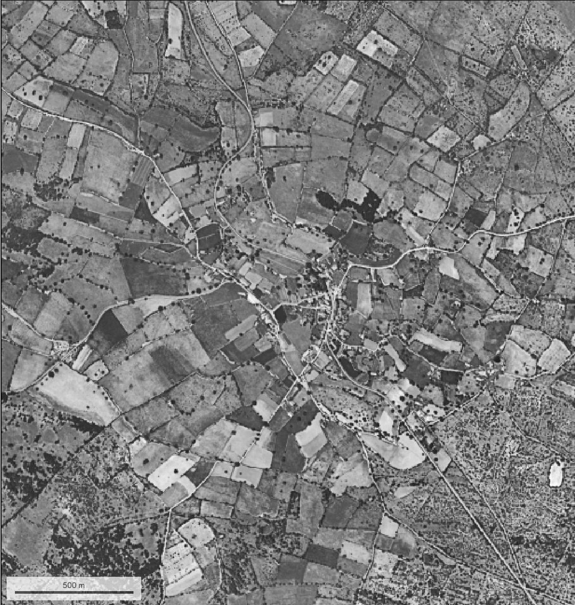 Cette organisation « centre-périphérie » (voir ci-dessous vue aérienne actuelle avec les deux cercles emboîtés, vue aérienne années 1960 et extrait de la carte IGN 1/50.000 actuelle) n’a guère changé depuis le début du XIXe siècle (voir ci-dessous carte d’état major, vers 1850), en dépit des variations de population.