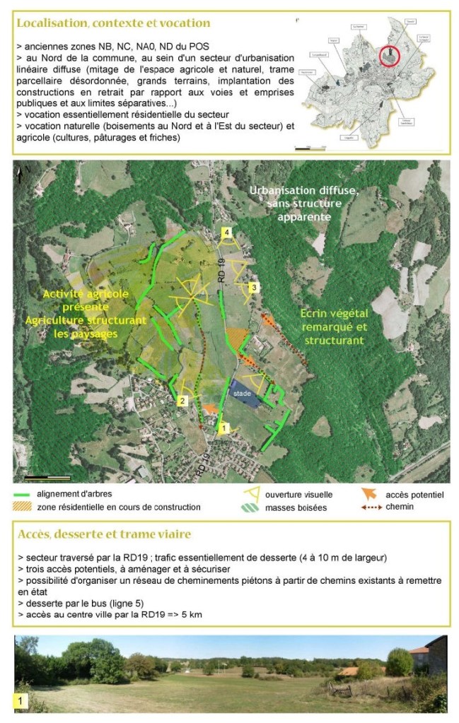 Vers le Nord (en fait Nord-Nord Est) : on est à hauteur du stade municipal de Panafé désormais accessible à pied en étant protégé de la circulation routière (RD19, vers Rouqueyroux). Le chemin continue encore quelques mètres le long de la route (à gauche de la photo), permet de la traverser au moyen d’un « passage protégé » et de revenir vers l’Oratoire de La Capelette. La forme n’est pas une enveloppe, mais un tissu qui lance ses fils vers l’avant. On voit les silhouettes des chênes d’un bocage où se sont insérés quelques pavillons récents. Plus au Nord, les prés, des vaches et leurs veaux. Vue sur le Ségala. La forme c’est donc aussi des côtoiements, des lumières, des perspectives, l’évocation de pays voisins dans lesquels elle s’imbrique ;