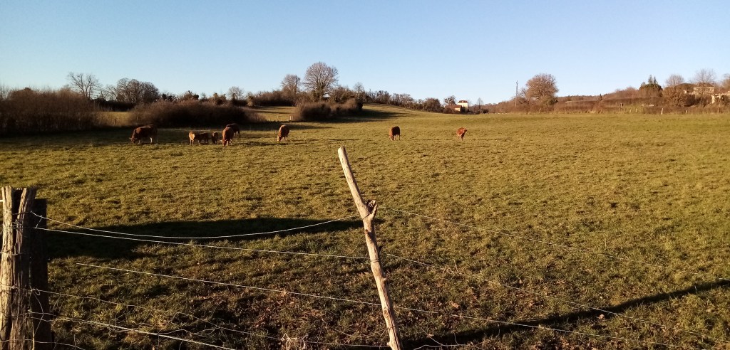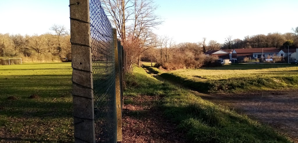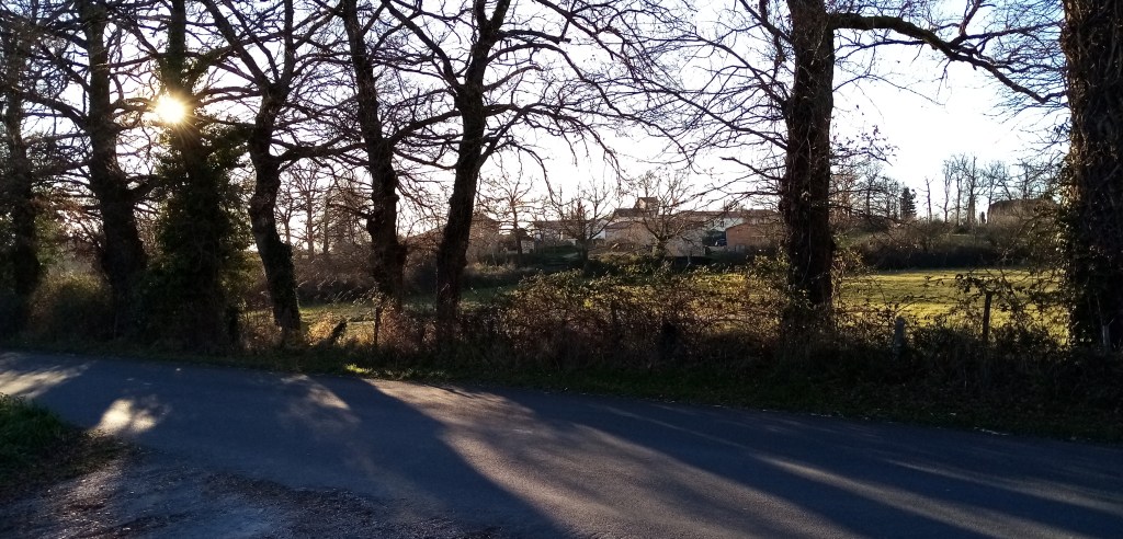 La forme de la ville sur son bord Nord-Est, cet après-midi, c’est cette lumière qu’on vient chercher, promeneurs avec chien ou pas ; c’est l’air vivifiant des premières pentes sous un soleil d’hiver qui baigne de la même façon pavillons, petits immeubles, ancienne ferme et bocage.