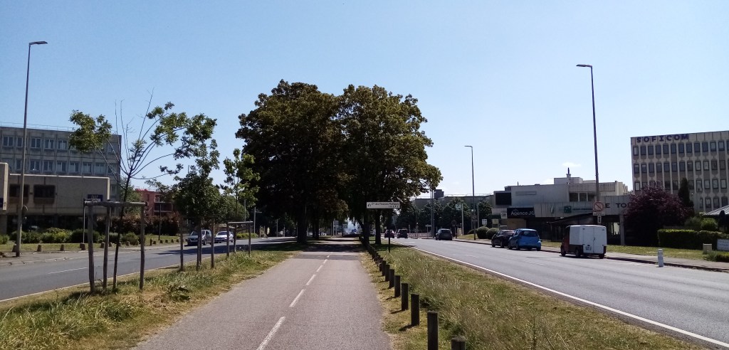 Pas sûr qu’il soit d’ailleurs tout à fait un quartier. Il est percé en son milieu par l’avenue de la Côte de Nacre, amorce de la principale sortie Nord de Caen, vers la Côte du même nom. Et, sur ses bordures Est (Pierre Heuzé) et Ouest (Calvaire Saint-Pierre) ses limites sont moins nettes que ne l’est cette avenue-trouée centrale. Il y a bien deux rues : l’avenue de Thiès à l’Ouest et la rue de la Délivrande à l’Oues mais c’est moins tranchant. Au Nord (Périphérique Nord) et au Sud (Avenue Copernic et rue Jules Verne), c’est plus clair : les axes routiers font des limites franches.