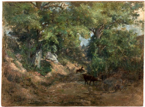 Depuis la balustrade du jardin, j’ai toujours eu l’impression d’un face-à-face. Avec d’autres maîtres de forges, les Le Veneur ont mangé la forêt pour alimenter leur industrie et en tirer les bénéfices qui ont permis leur train de vie. Je me demande comment ils voyaient la forêt. Si on leur avait demandé en en 1860-1870 de nous dessiner la forêt telle qu’ils la voient, qu’auraient-ils représenté ? La forêt de Théodore Rousseau (les Gorges d’Apremont, forêt de Fontainebleau, 1858) ou celle de Gustave Courbet (le Cerf dans la forêt, 1867) ?