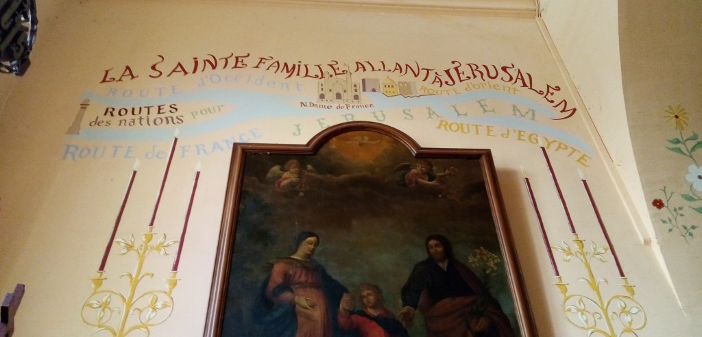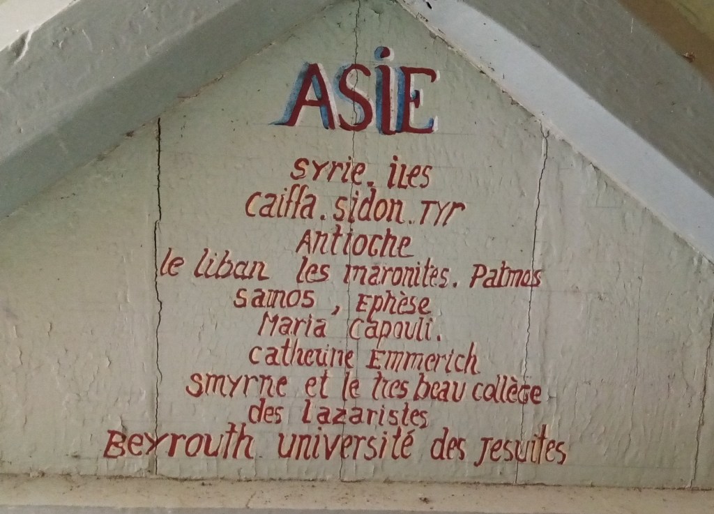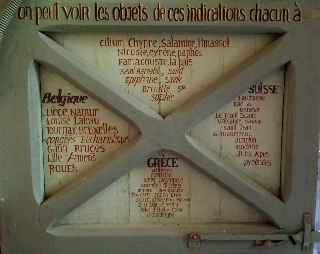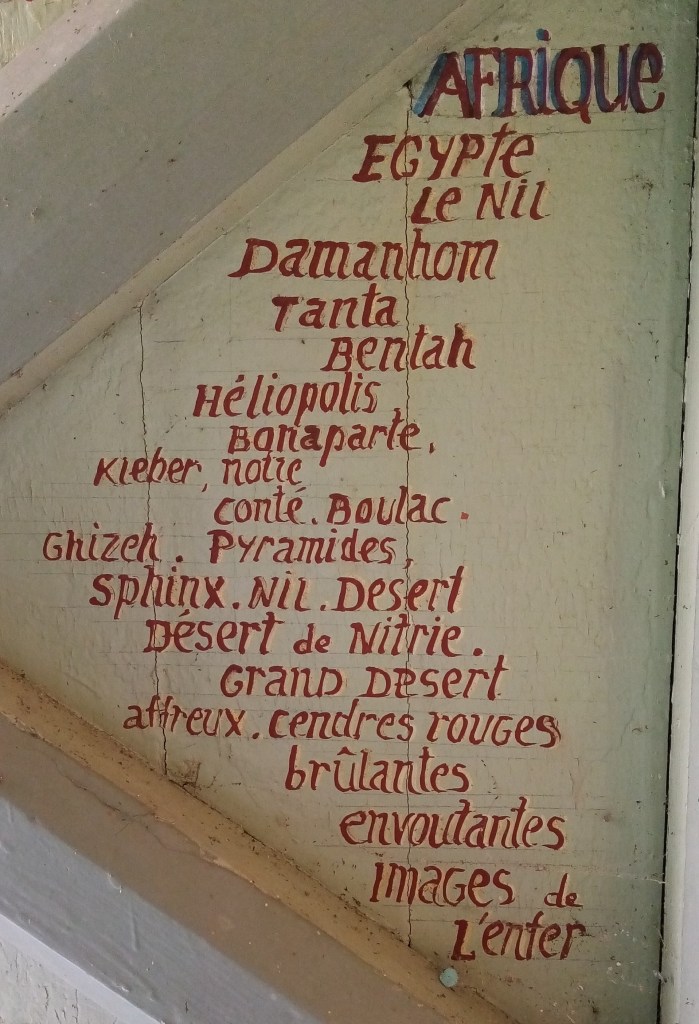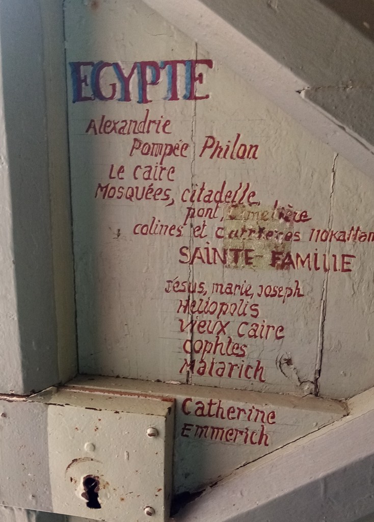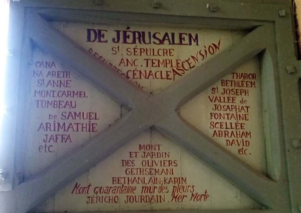 L’abbé a fait peindre sur la face intérieure de la porte d’entrée les trajets du pèlerin très actif qu’il a été. L’Europe, l’Asie, l’Afrique, la Terre sainte y sont représentées par des listes de noms de lieux et de figures.