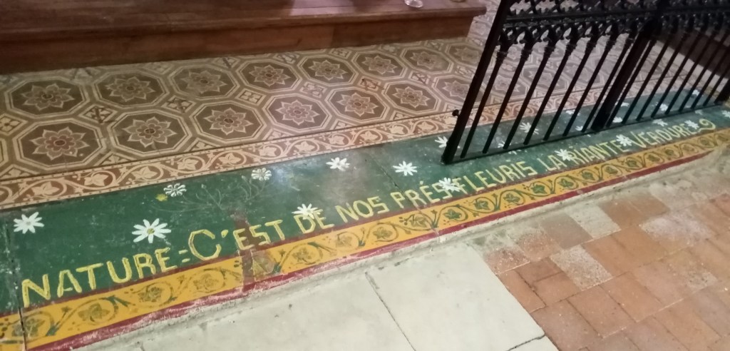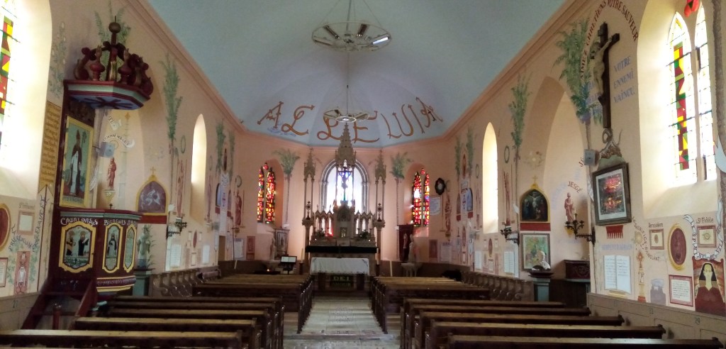 Un élément d’unité du décor surabondant de cette église est la représentation de palmiers qui relient le sol à la voûte. Ce motif réfère au monde proche-oriental pratiqué en pèlerin par l’abbé Paysant. Par contraste, des paysages schématiques en bordure de figures saintes semblent plutôt évoquer l’espace local.