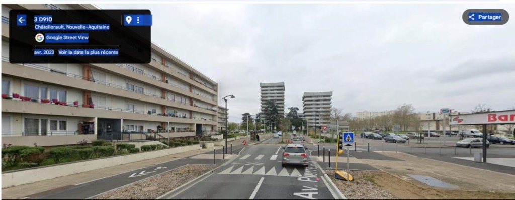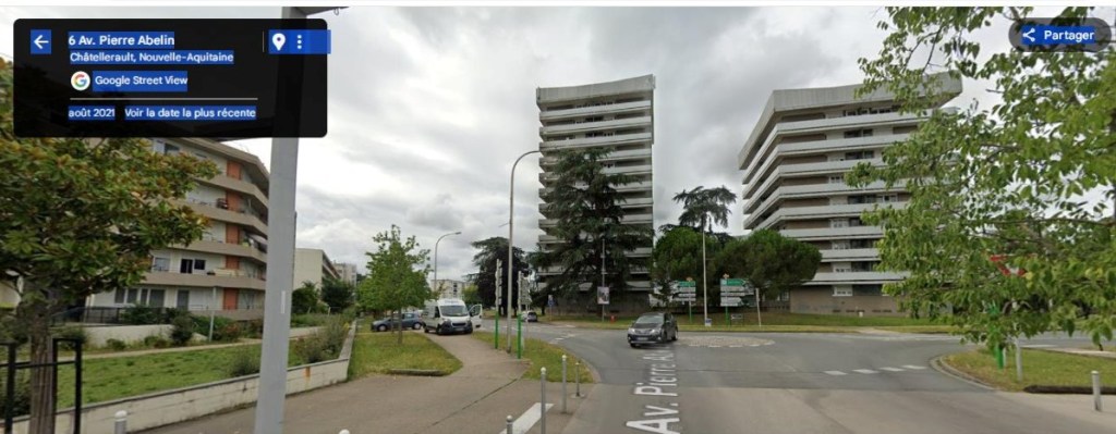 Nous n’y sommes pas retournés ce 20 juillet 2025. Il m’a semblé apercevoir le haut d’un de ces immeubles depuis le site de l’ancienne manufacture. C’est ce qu’il faut voir dans la photographie ci-dessous. Nous étions garés au bord de la rivière, au Nord du centre-ville et nous n’avions pas le temps de « faire le tour » de Châtellerault. Alors j’avais cherché des yeux, ces anciens signaux de bord de route.