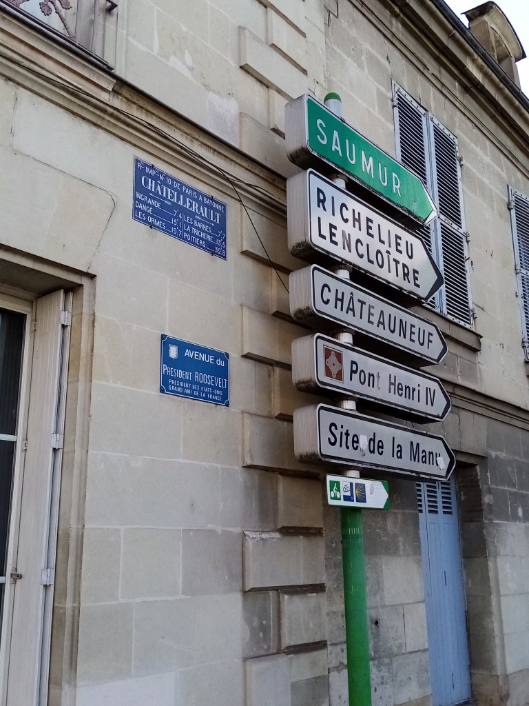 On y trouve les noms des communes traversées au Nord dans le département de la Vienne (Ingrandes, Dangé, Les Ormes). S’y sont ajoutées comme par sédimentation diverses signalisations : pour le transit automobile, pour les cyclistes, pour un monument historique et pour l’ancienne Manufacture d’armes de Châtellerault devenu « Site de la Manu ». On pourrait faire l’histoire des villes à partir des signalétiques accumulées.