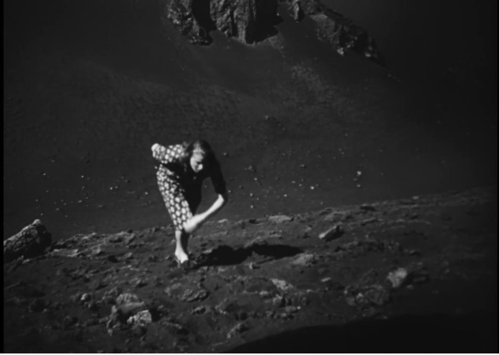 Le dernier élément du triptyque est la partie sommitale du volcan, à proximité des cratères. C’est là où Karin est immobilisée. D’autres photographies de cet espace en donnent l’image similaire d’un sol lunaire, sombre. Roberto Rossellini cadre de façon serrée Ingrid Bergman. Elle est allongée ; dos au sol, fixe les étoiles que l’on voit à notre tour. C’est un autre monde, au-delà de tout ce que l’on a vu jusqu’à présent.