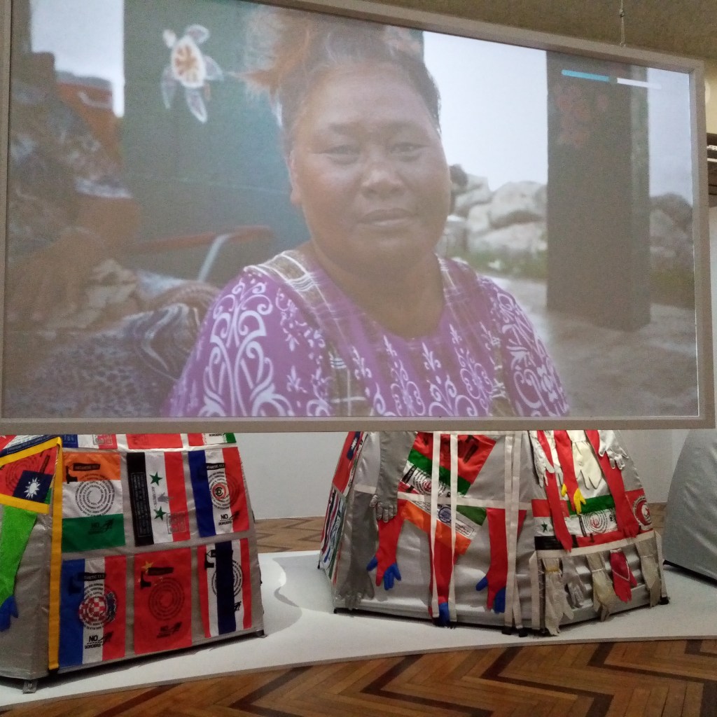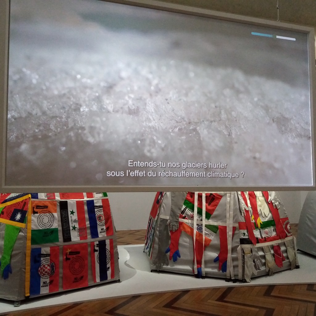 Ce poème en images est diffusé sur écran au-dessus de l’installation de Lucy + George Orta. Sa diffusion est pour moi le moment le plus beau de l’exposition. Pas de carte, mais une représentation d’un même monde menacé à partir de coquillages ramassés sur l’atoll de Bikini et de galets ramenés du rivage de Nuuk que les deux poétesses ont amené l’une à l’autre.