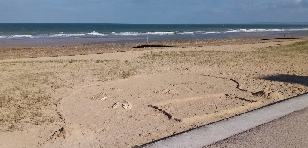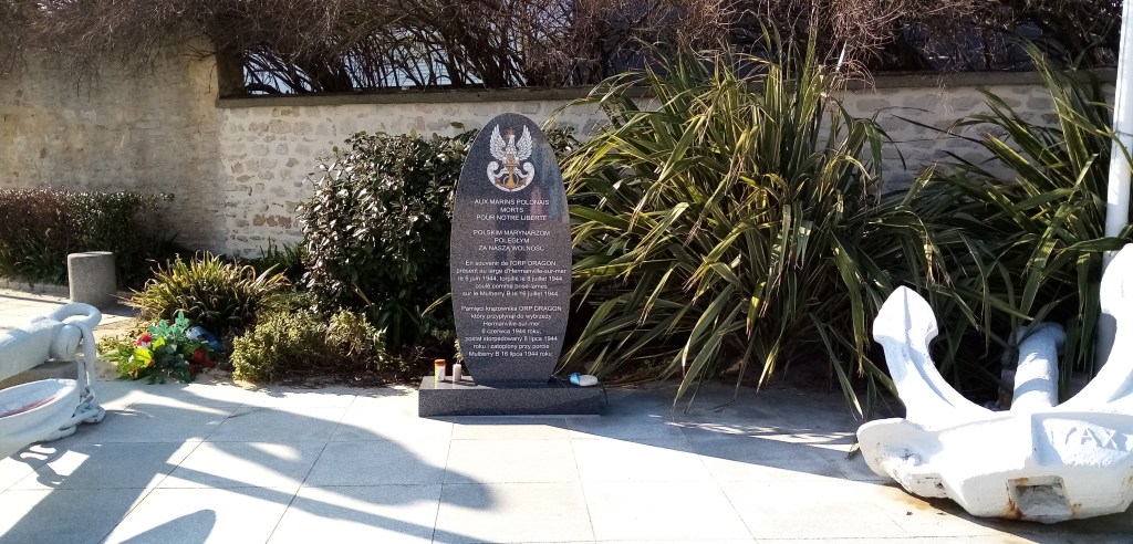 Il y a quatre-vingt ans, la Brèche : un des théâtres du Débarquement de juin 1944. Décor de guerre ; des mémoires s’y accumulent : norvégienne, polonaise, alliée. Monuments, inscriptions, affichages, photographies pour se souvenir (voir ci-dessous). C’est par là que nous quittons la digue pour nous diriger vers le café Courbet.