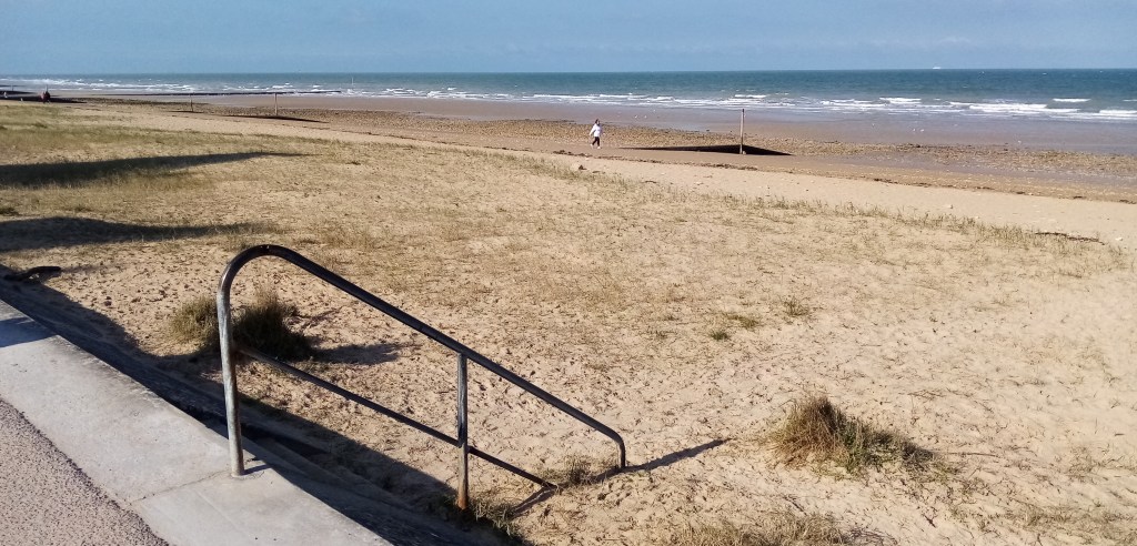 Se garer à Lion-sur-Mer et arriver sur la digue par la rue principale. C’est vers la droite (vers l’Est) qu’il faut tourner pour aller à la Brèche d’Hermanville. La baie de l’Orne en panoramique, c’est-à-dire jusqu’à la baie de Seine. On devine Cabourg, Houlgate, plus loin on imagine Trouville. De l’autre côté de la baie, les cheminées de la centrale du Havre dans la brume. Dans notre dos, le car-ferry est encore au large, mais s’approche en biais du port de Ouistreham.